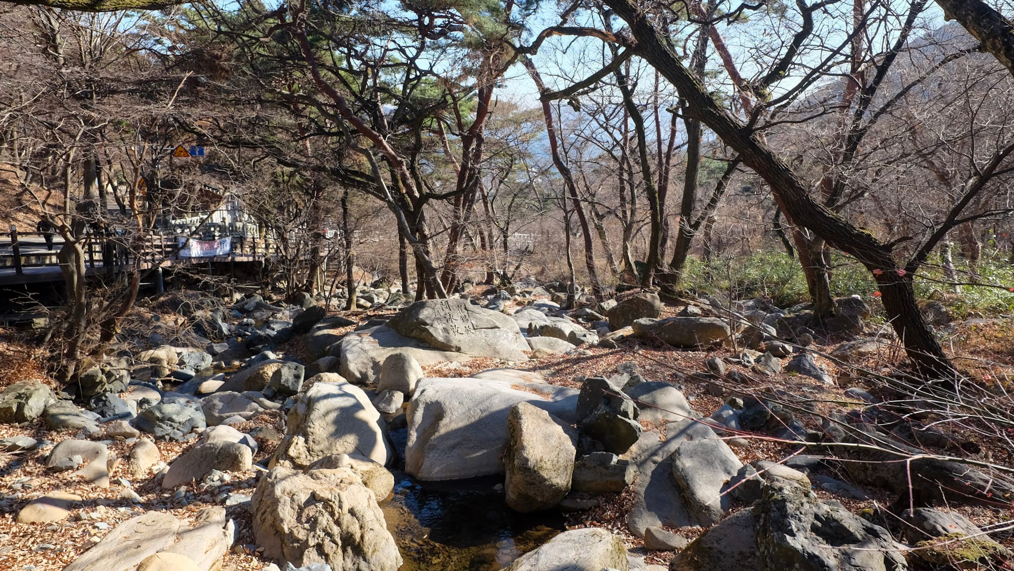 We were in Busan, Korea, heading to the ancient city of Gyeongju. The buses leave every 30 minutes, so there is time. The weather was cold, but we were properly dressed. We put our luggage into a locker. The bus to the temple was winding up through the mountains, passing smaller towns and villages. It was great to get out of the city and be surrounded by nature. It was mostly browns since it was winter. It was wonderful to get away from people. We got off the bus and started walking up to the temple.