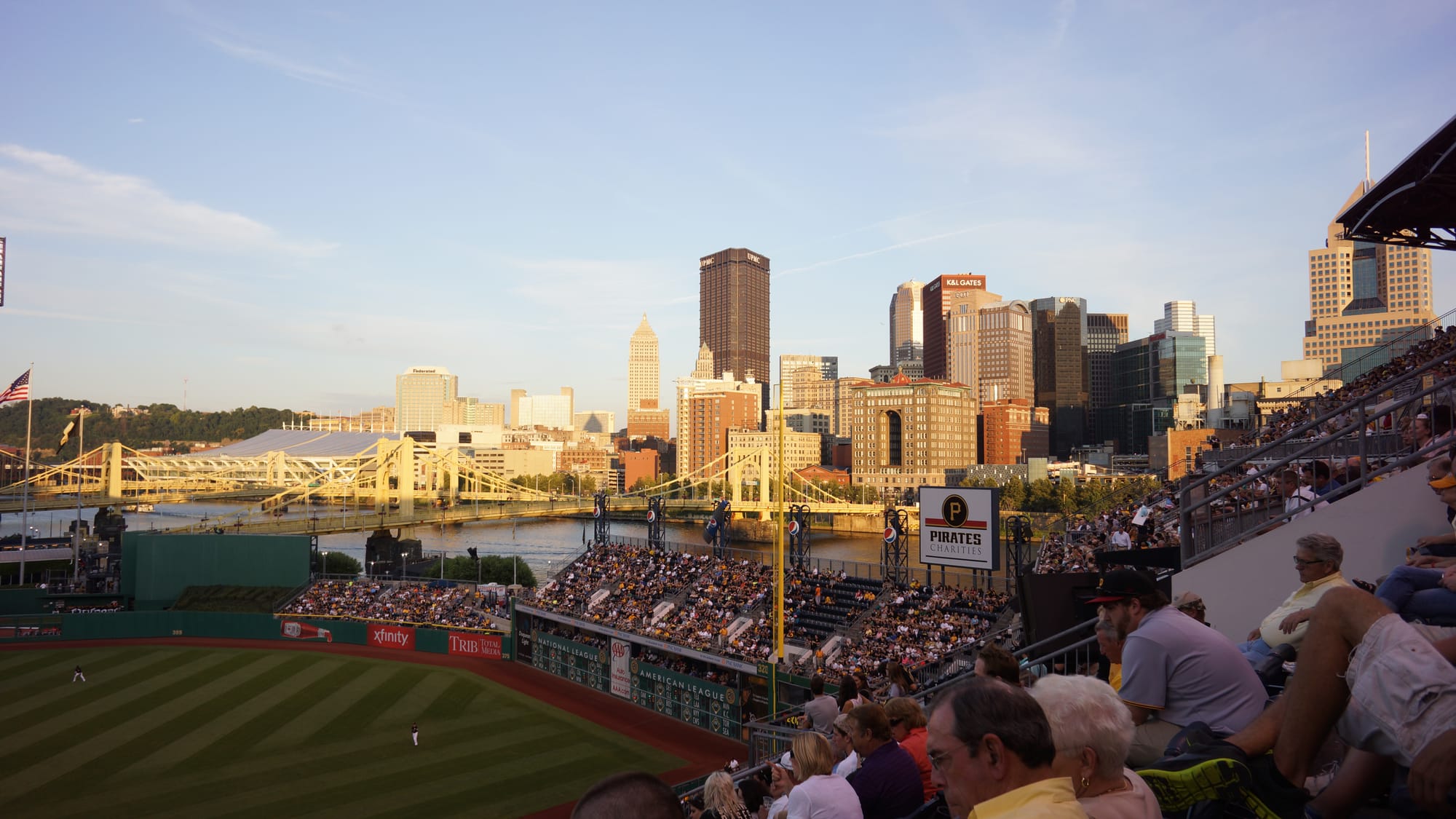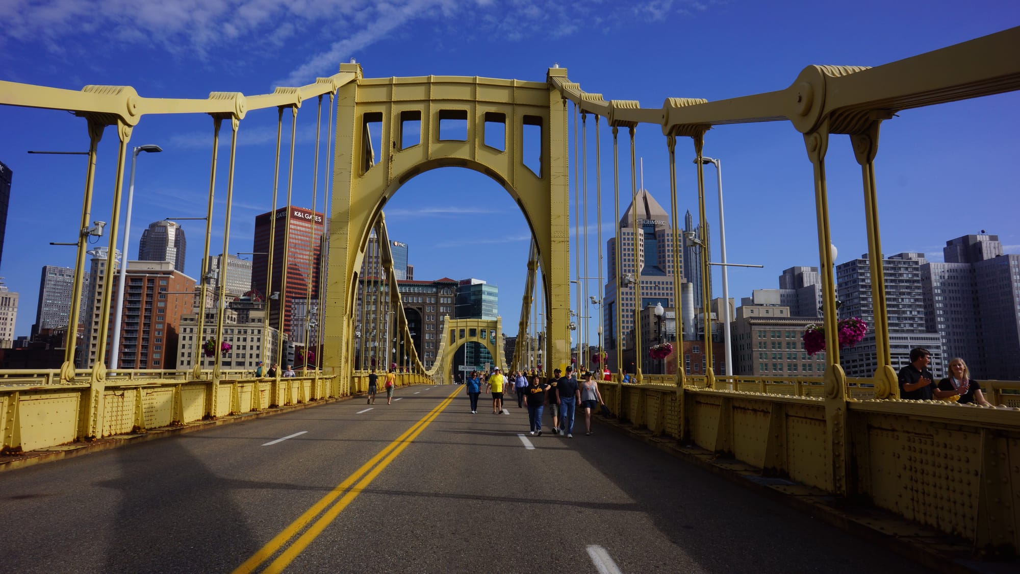 The Roberto Clemente Bridge spans the Allegheny River and connects the downtown of Pittsburgh with the ball diamond of PNC Park. The bridge was once called the Sixth Street Bridge but was renamed after one of the greatest Pirates ever, who died in a plane crash delivering medical supplies to victims of an earthquake in Nicaragua. The bridge is closed on game days. We crossed as the sun was low in the sky. The crowd on the bridge was not that big, but it was still an hour and a half before the first pitch.