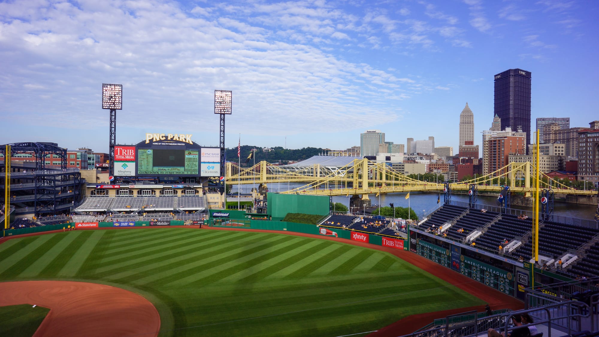Father and I walked into the front gates using the phone as tickets. Paperless tickets are a great way to go. We were given a free program that listed the home team in detail but provided few details about the visitors. Having listened to Dan LeBatard, I knew a lot about the Miami Marlins and knew how bad they were. We went in, and I was impressed. I stood behind home plate with the downtown of Pittsburgh as a backdrop. It looked stunning. We went up to the 3rd level, where our seats were. The seats were perfect, but they should have been for $50. A guy escorted us to our seats and wiped them down from whatever was on them. All my father could say was “wow.” The sun was still coming down, and the downtown area glowed with it. The grounds crew were still. Watering the green grass and the deep red clay of the infield. We would be able to see everything. We were high, but it was a perfect view. My father was happy with the place, so I was as well.