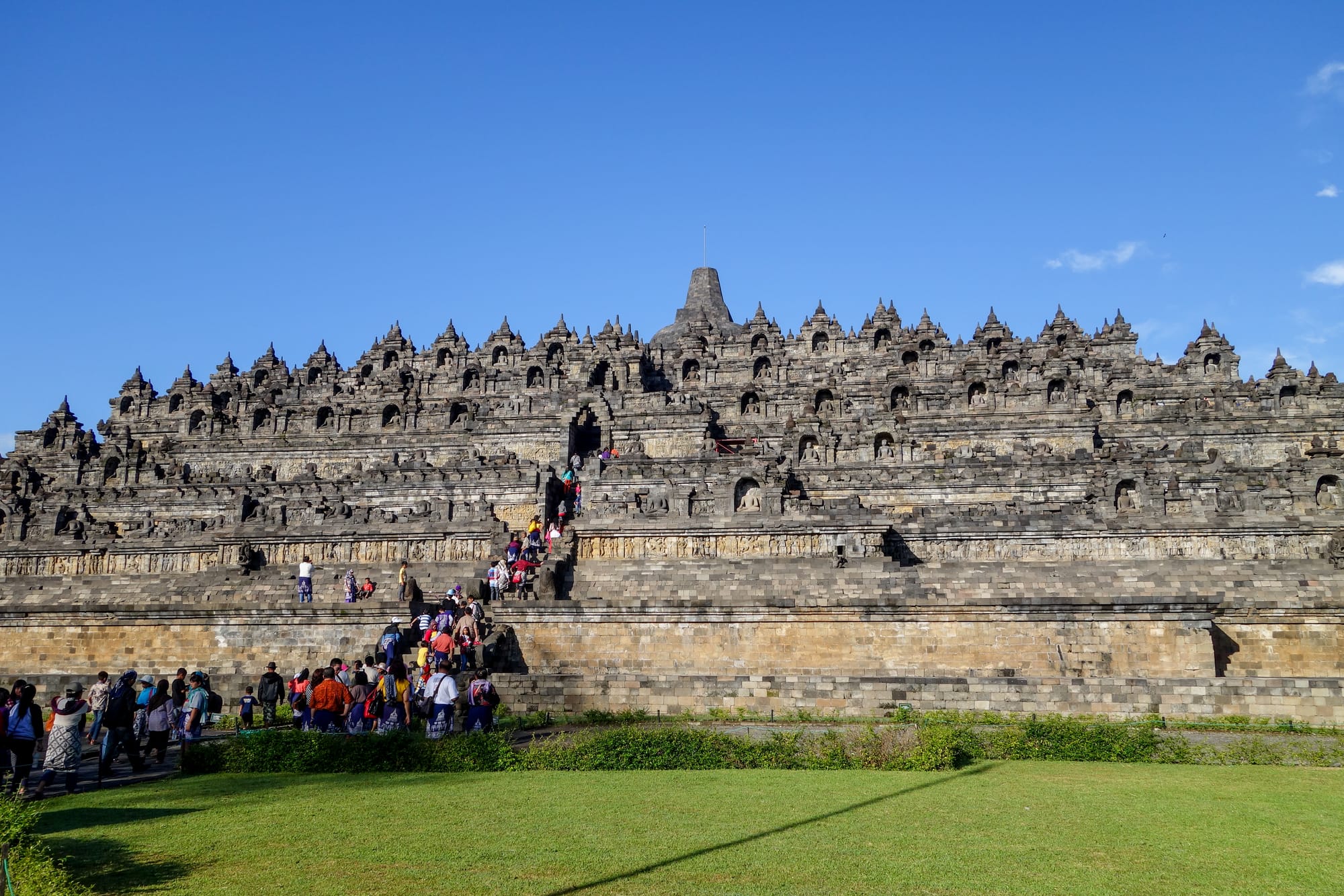 We drove down from the hill to Borobudur. We got a guide to walk us through. It is the oldest structure in Indonesia, built in the 9th century and even older than Angkor Wat by a hundred years. The layout is the path to enlightenment, with the base being the biggest. It is the stage where all people are solely controlled by their desires. They are not free but slaves to want and possessions. There are no carvings on the outer wall. The second level is the beginning of the desire to take control of one's life. There are carvings of the story of the Buddha and his path towards enlightenment. The third level, the engravings are more detailed and about the path. On the next level were stupas with no carvings, and on the top was a 5-point stupa representing the five truths. The whole complex has been saved after earthquakes and the eruption of a nearby volcano in 2010.